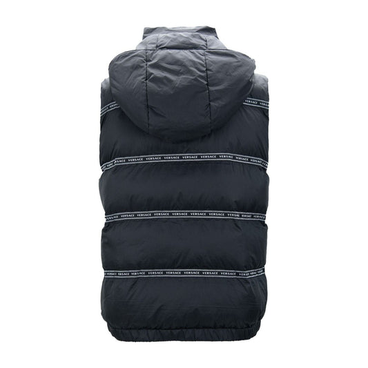 سترة فيرساتشي أنيقة باللون الأسود مع شريط شعار وغطاء رأس قابل للفصل