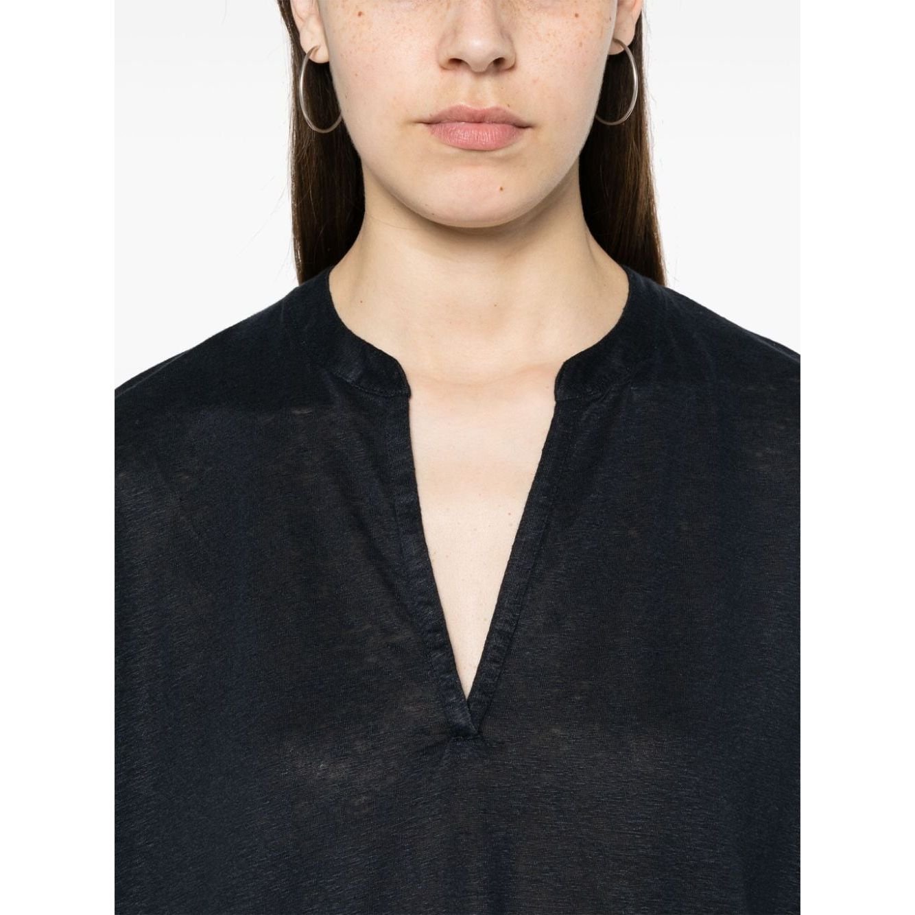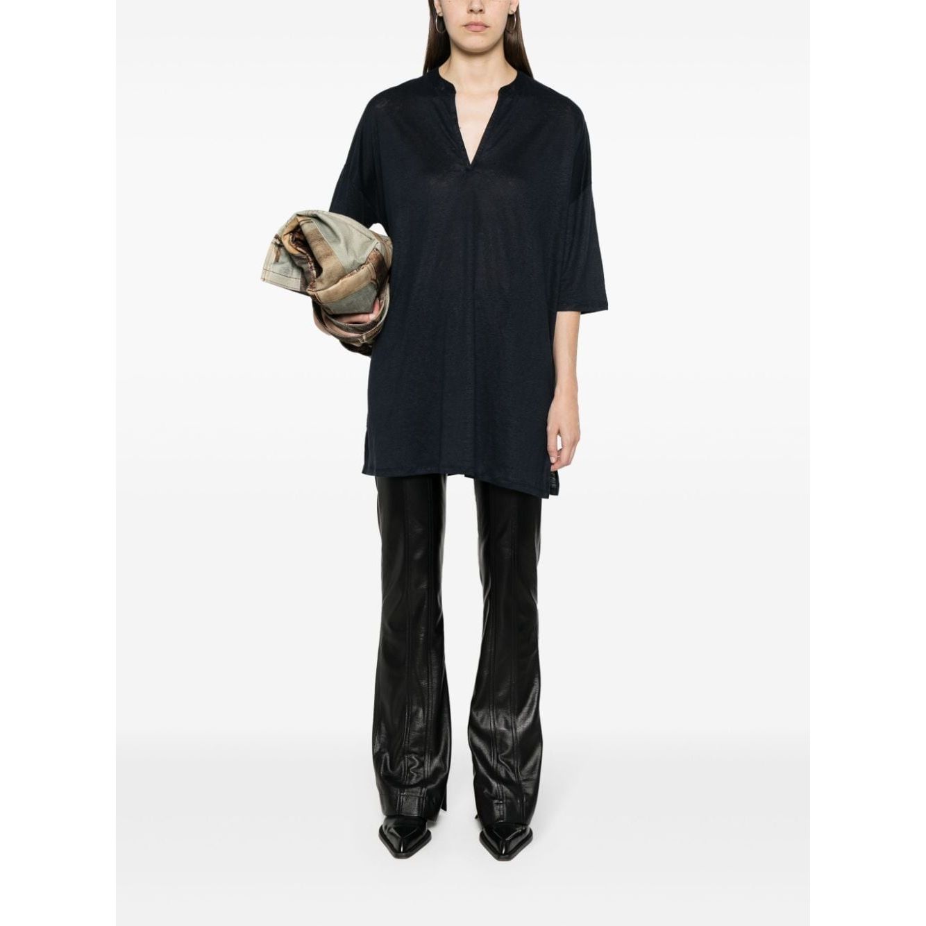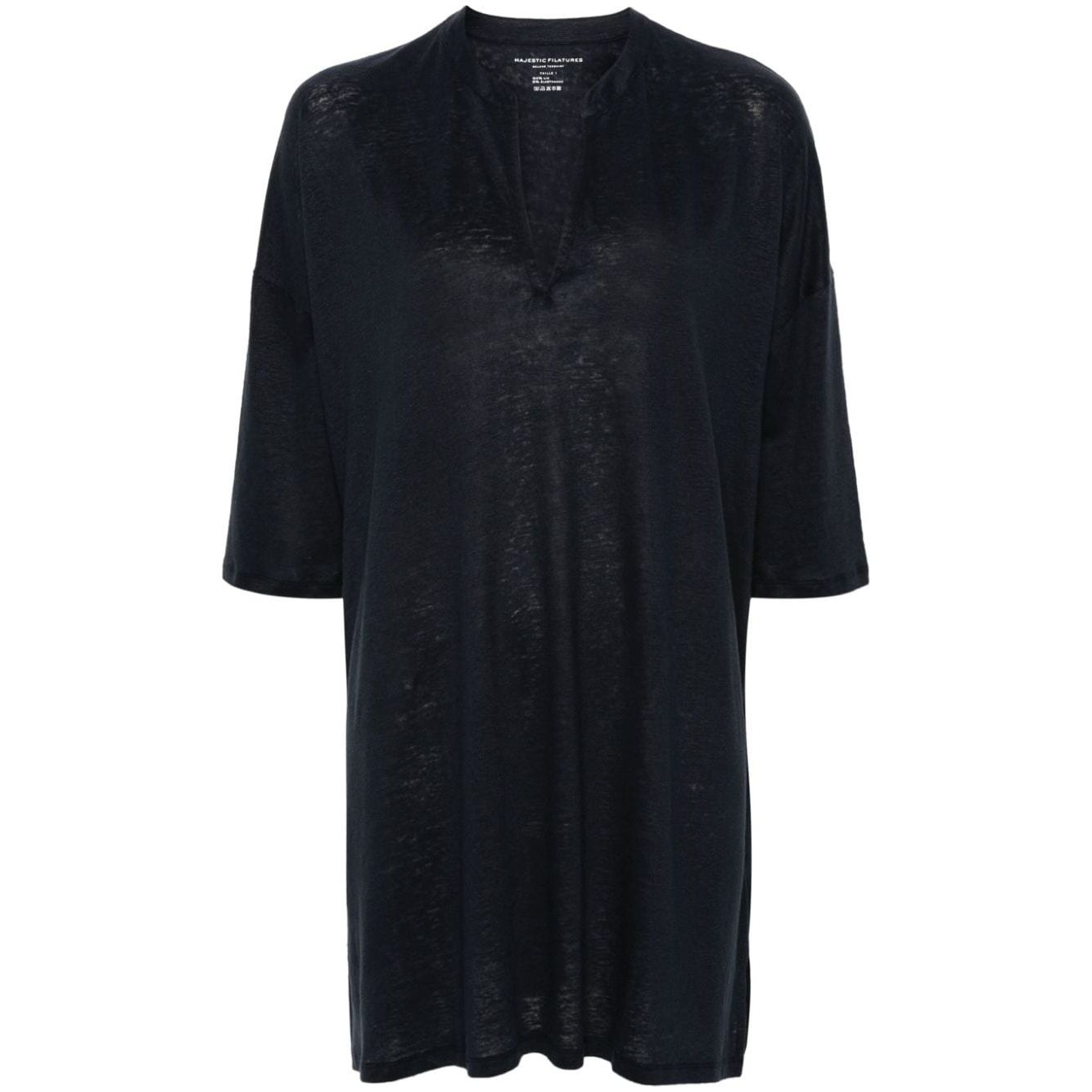 navy blue linen blend stretch-design slub texture V-neck three-quarter length sleeves side slits straight hem This item contains at least 50% materials which are certified or widely recognised as having a lower environmental impact through production and/or manufacturing processes that reduce water consumption and the use of harmful chemicals, or re-use by-products of the production process. Learn more about what makes a product Conscious on our Conscious Criteria page Linen blend tunic dress Size and Fit - This piece fits true to size. We recommend you get your regular size. Model is 1,75m / 5ft 8in wearing size 1 (NUM)