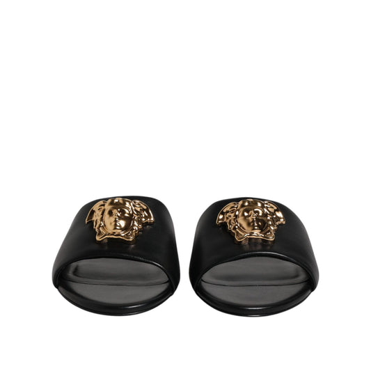 Versace Black Leather Logo Plaque Slip On Slides Flats Shoes
