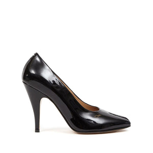 black lambskin branded leather insole split toe slip-on style 110mm high cone heel Tabi patent pumps Size and Fit - Heel 4,3 in / 11 cm