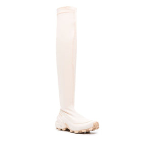 White boot, printing with side logo, design pull on, side closure with short zip, length above the knee, rubber and round pointed sole. Over-the-knee boots Size and Fit - Heel 2,4 in / 6 cm; Platform 0,8 in / 2 cm