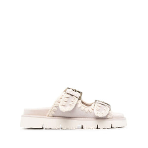 white/beige calf leather/fabric crochet knit gold-tone buckle fastening chunky rubber sole Bio Low sandals Size and Fit - Sole 2 cm