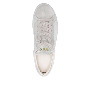 light grey front lace-up fastening padded ankle branded leather insole flat rubber sole Suede leather sneakers Size and Fit - Heel 1 in / 2,5 cm